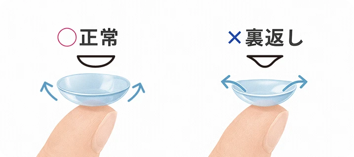 ソフトコンタクトレンズは柔らかいため、裏返しになっていることがよくあります。付ける前に必ず確認をしましょう!