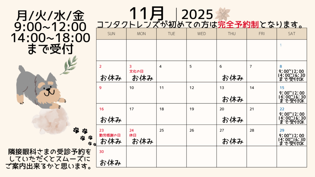 コンタクトレンズ検査の受付は 平日は朝9時~12時・14時~18時まで!!