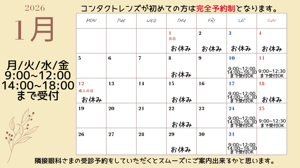 コンタクトレンズ検査の受付は 平日は朝9時~12時・14時~18時まで!!