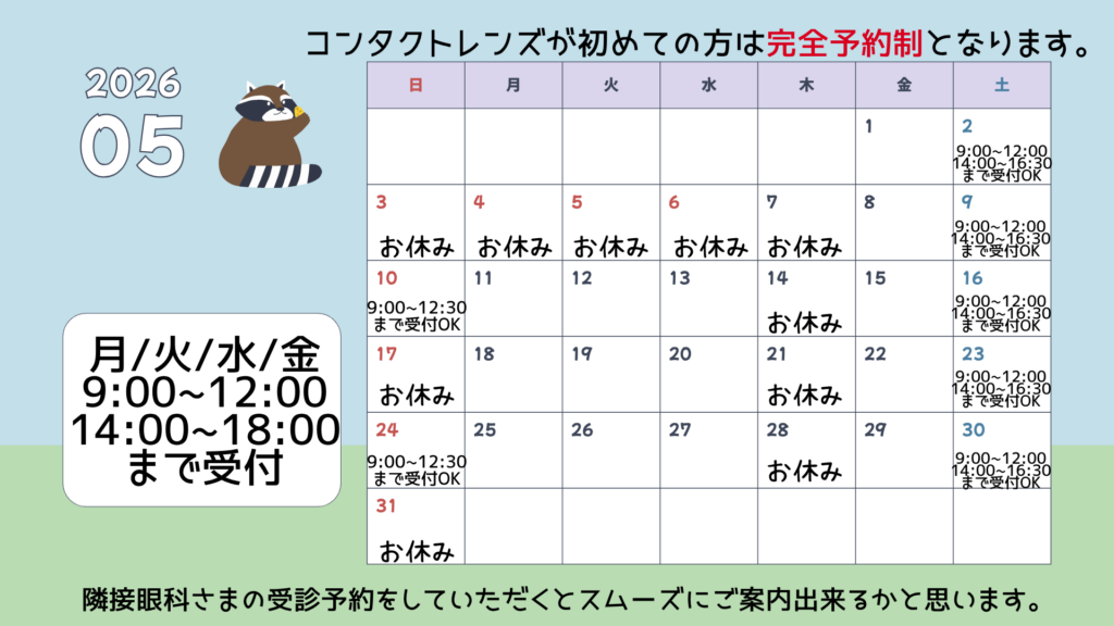 コンタクトレンズ検査の受付は 平日は朝9時~12時・14時~18時まで!!