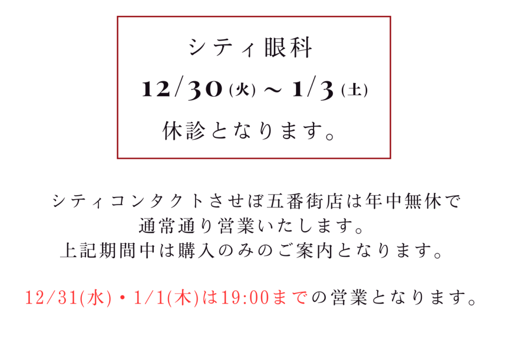なお、年末年始はメーカー休業のため、コンタクトレンズがご注文となる場合お渡しに通常