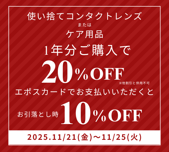 11/21(金)~11/25(火)の期間中、コンタクトレンズまたはケア用品を1年分のご購入で20%OFF!