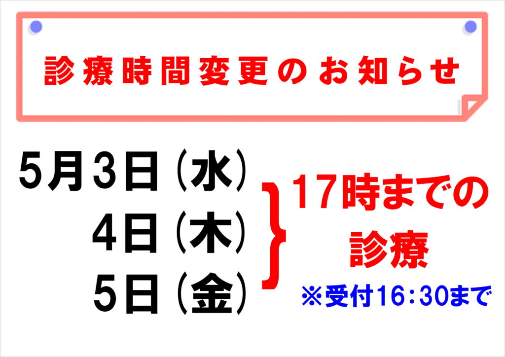 5/3(水)4(木)5(金)の3日間は17時までの診療となります。受付は30分前までです。