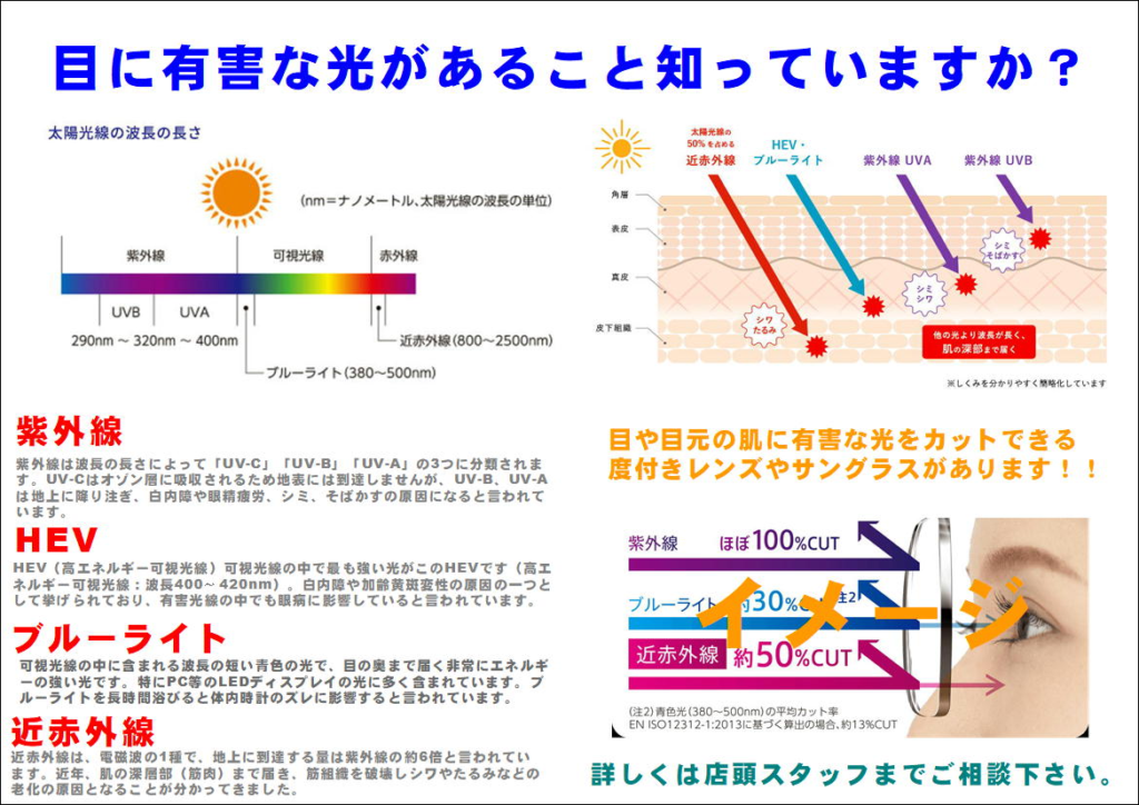 紫外線だけでなく、眼病に影響しているHEV(高エネルギー可視光線)を大幅にカットし、シミやたるみの原因である近赤外線も最大限にカットします!