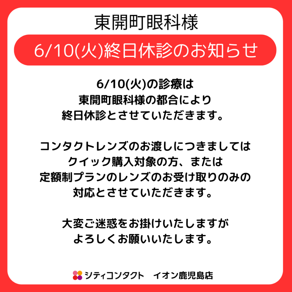NEWS 【イオン鹿児島】6/10(火)眼科終日休診のご案内