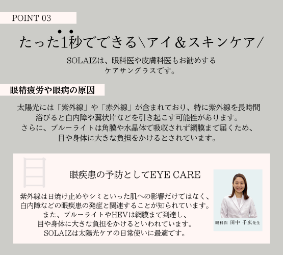 アイケアもスキンケアもできる新機能ケアサングラス「SOLAIZ(ソライズ)」です😎