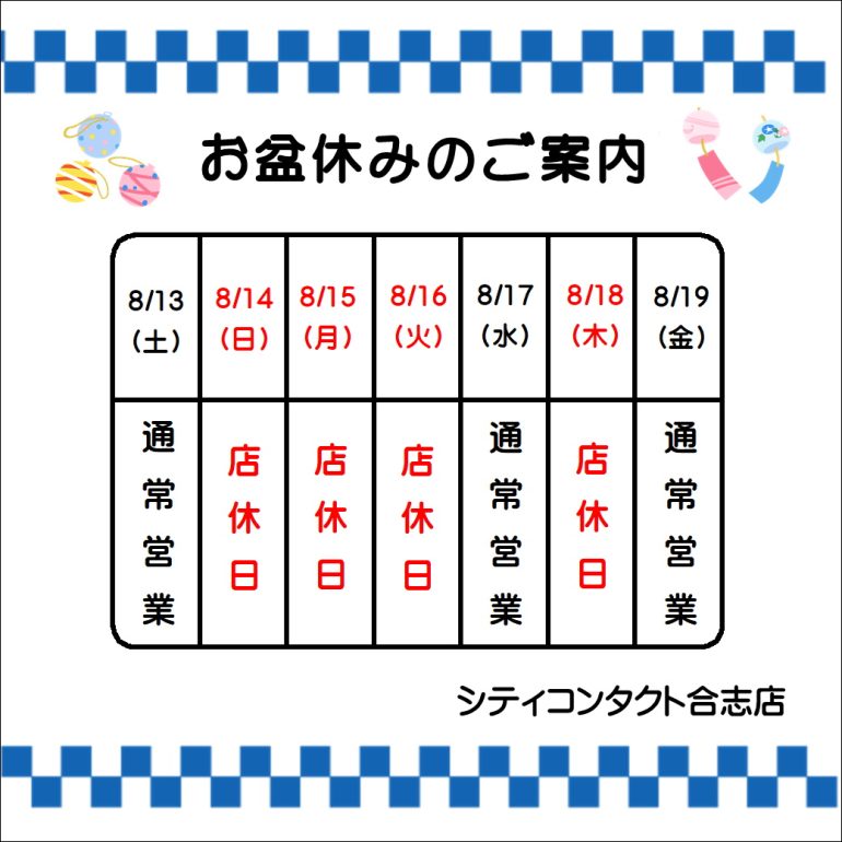 NEWS 【合志店】お盆休みのご案内😎🍨 ホーム 合志店 新着情報 【合志店】お盆休みのご案内😎🍨 お知らせ 2022.07.20 【合志店】お盆休みのご案内😎🍨 こんにちは シティコンタクト合志店です 毎日暑いですね 水分はこまめに摂りましょう お盆休みのご案内です 連休前は混雑が予想されますので ご来店はお早めに