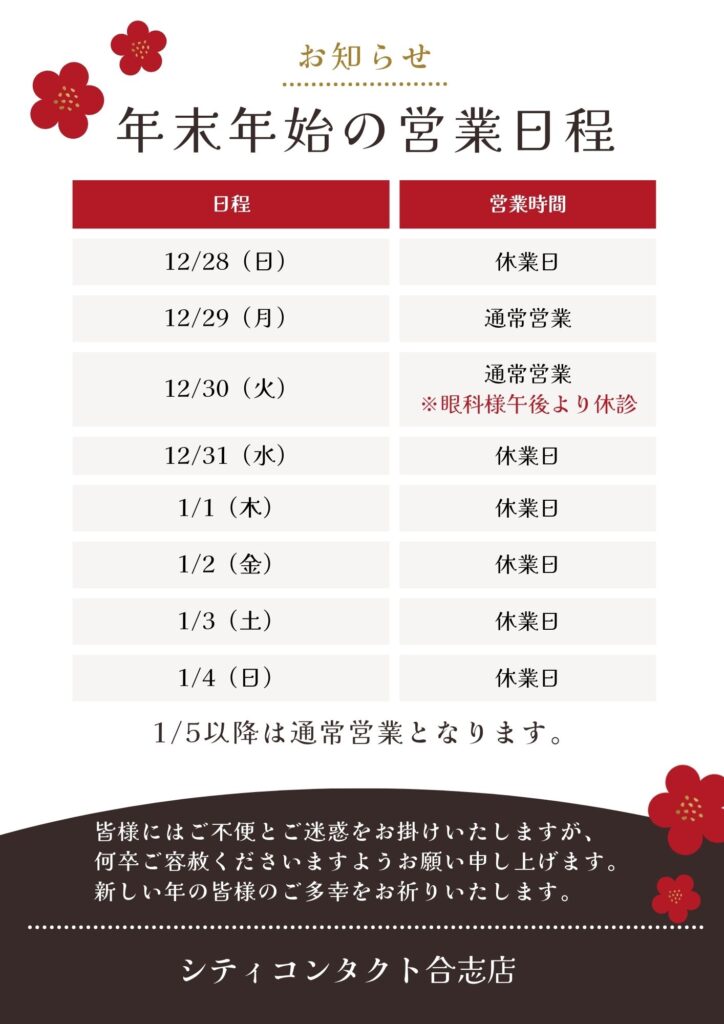 また、年末年始休はメーカー休業となる為、コンタクトレンズが注文の場合は商品のお渡しに通常よりもお日にちがかかる場合がございます。ご自宅の在庫をご確認の上、お早めの注文・ご来店をお願いいたします。