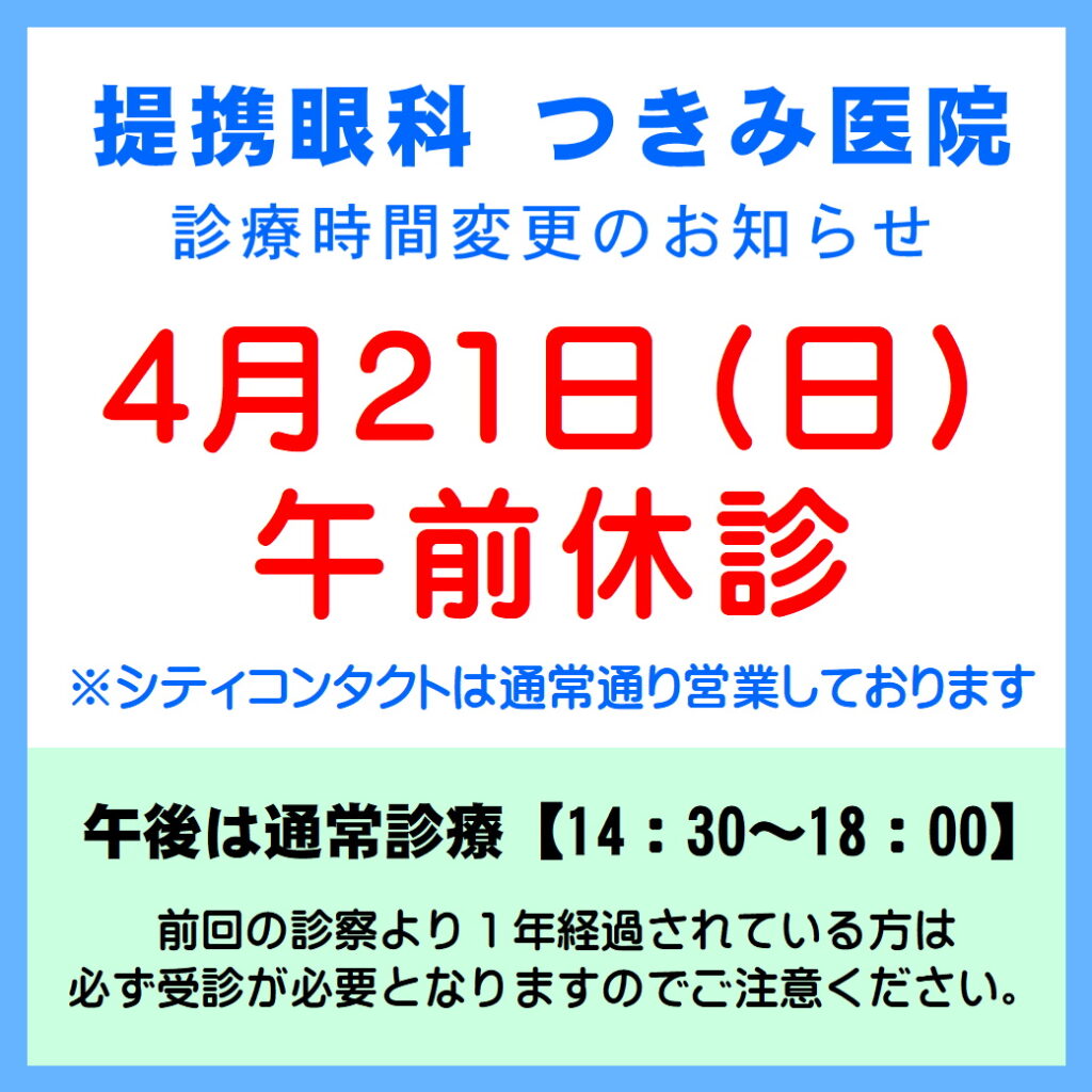 2024/04/21(日)は提携眼科が午前のみ臨時休診でございます。