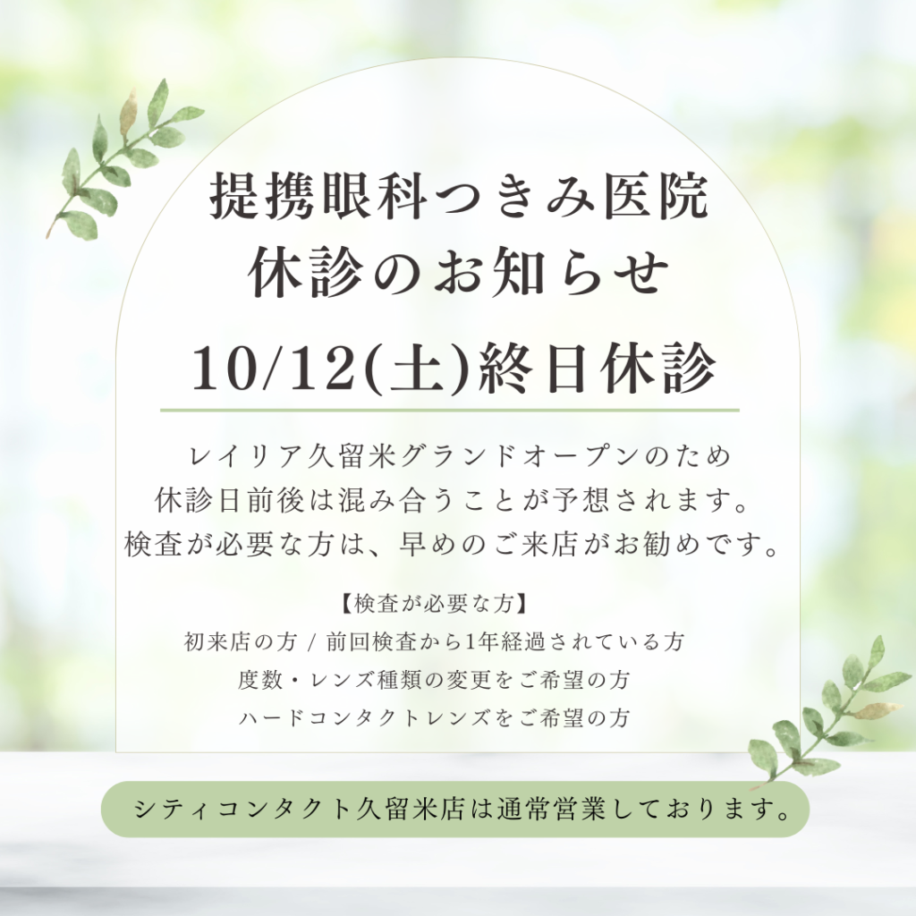【久留米店】10/12(土)提携眼科休診のお知らせ