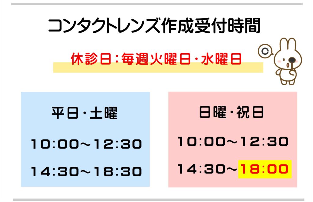 ご予約、コンタクトレンズ作成受付時間は下記をご確認いただければ幸いです。