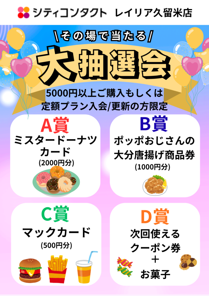 参加条件:店頭で5,000円以上のご購入、もしくは定額プランへの入会/更新の方