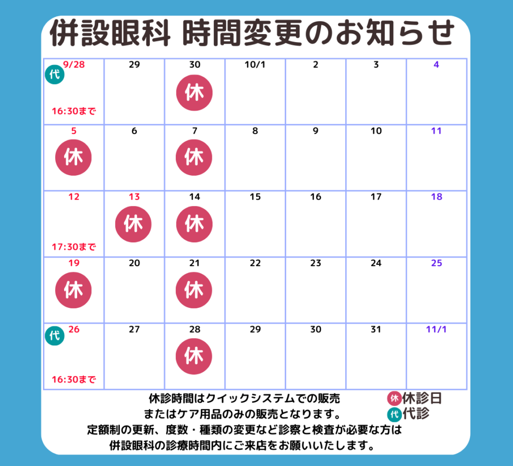NEWS 【姪浜店】10月 併設眼科様 営業時間変更・休診日のご案内