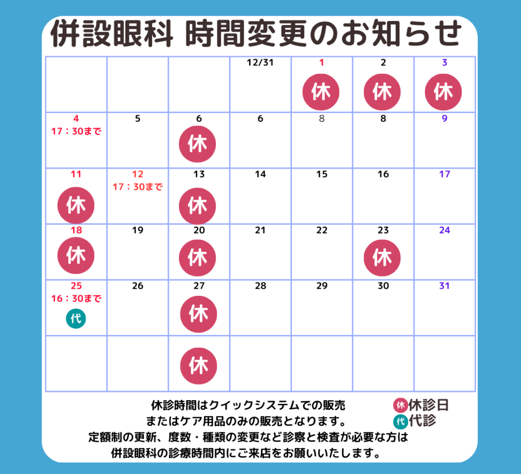 NEWS 【姪浜店】1月 併設眼科様 営業時間変更・休診日のご案内