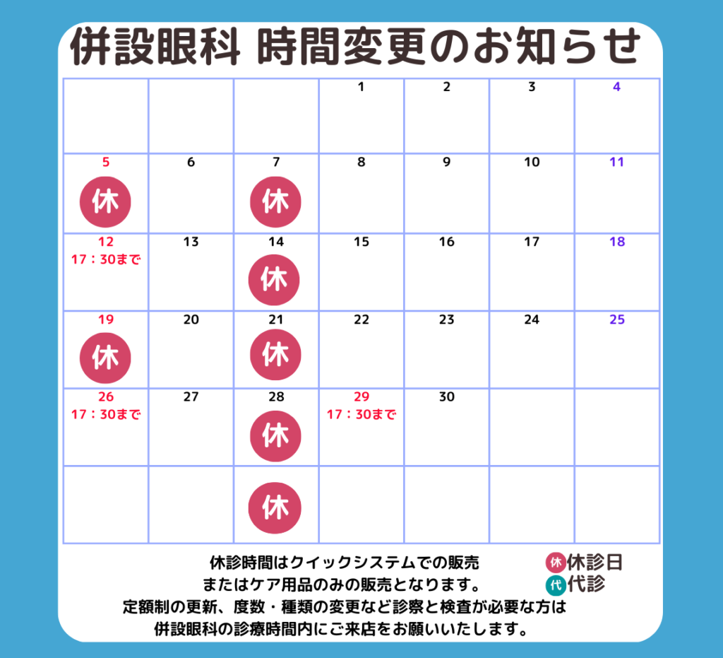 【姪浜店】4月 併設眼科様 営業時間変更・休診日のご案内