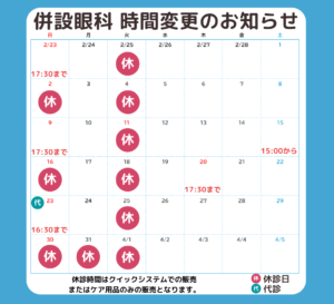 【姪浜店】3月併設眼科様 受付時間変更のお知らせ
