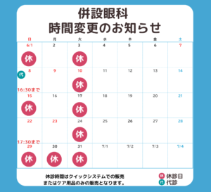 【姪浜店】6月 併設眼科様 営業時間変更・休診日のご案内