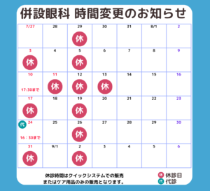 【姪浜店】8月 併設眼科様 営業時間変更・休診日のご案内