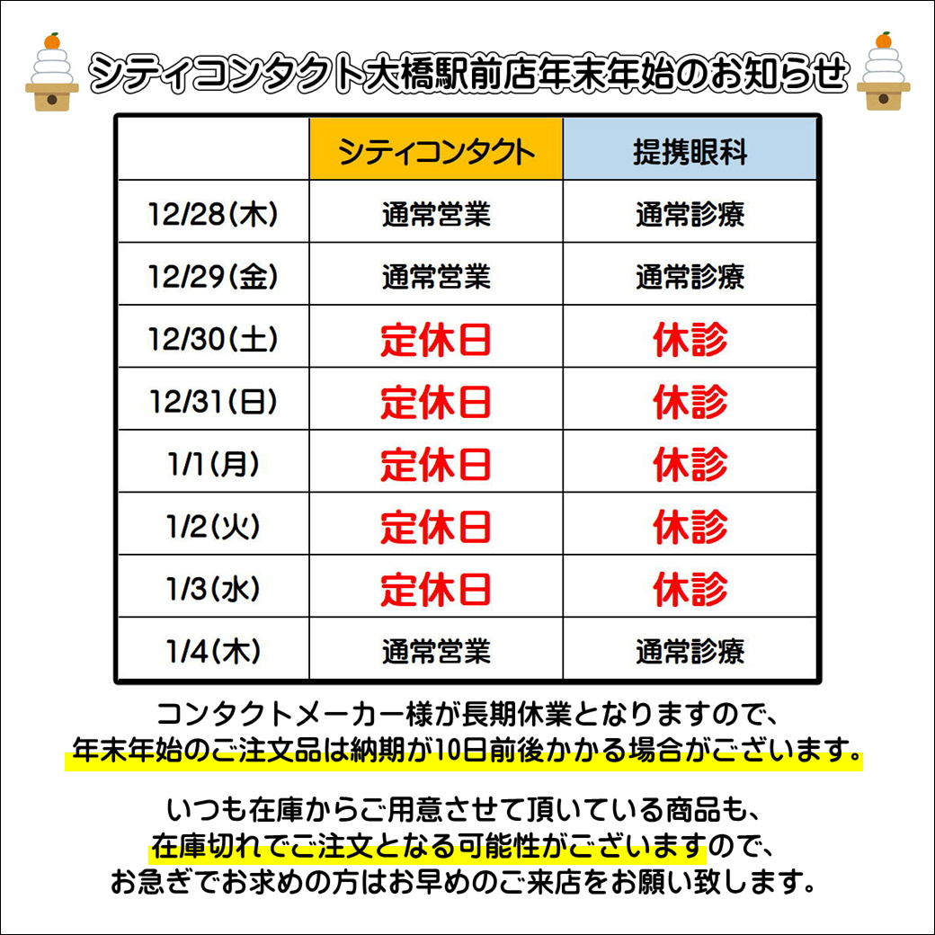 【大橋駅前店】12月提携眼科休診日と年末年始お休みのお知らせ⛄❄❄