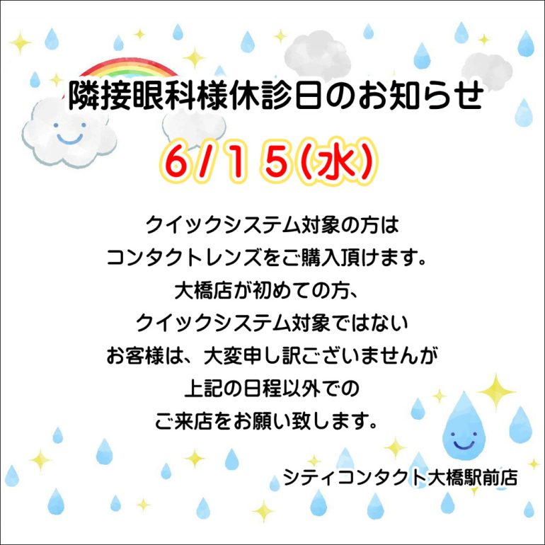 【大橋駅前店】6月度併設眼科様休診日のお知らせ