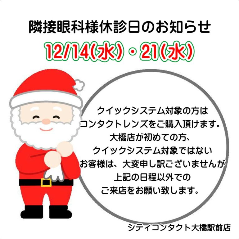 【大橋駅前店】12月度併設眼科様休診日のお知らせ