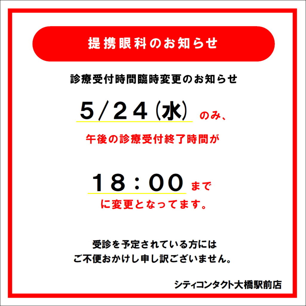 【大橋駅前店】5月24日(水)診療受付終了時間変更のお知らせ