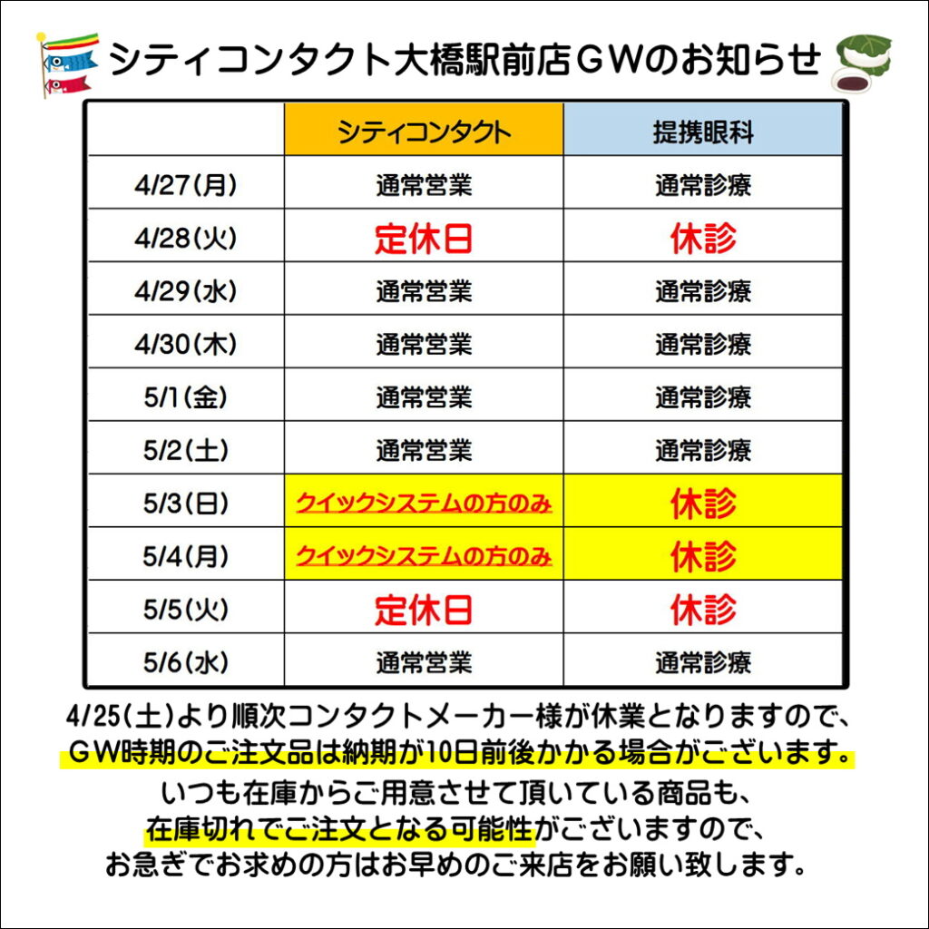 【大橋駅前店】ゴールデンウイークお休み及び提携眼科休診日のご案内🎏