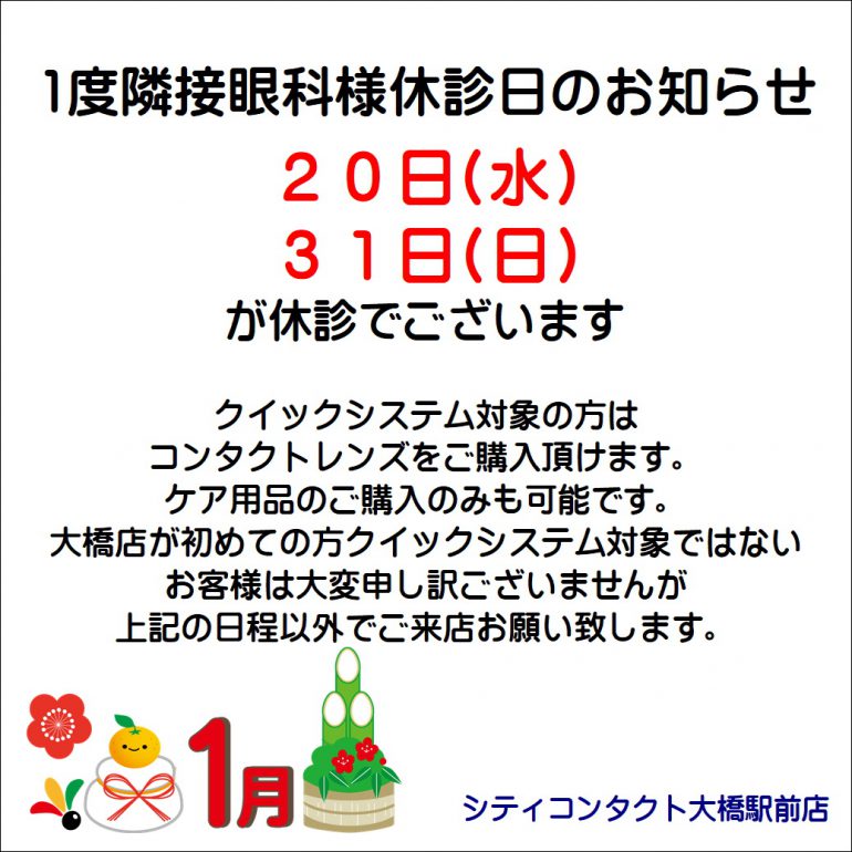 【大橋駅前店】最新版 1月度隣接眼科様休診日のお知らせ