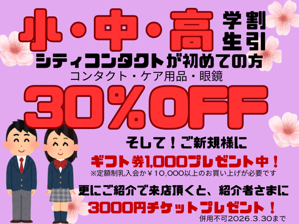 小・中・高のコンタクトレンズがはじめての学生さんは3/30まで