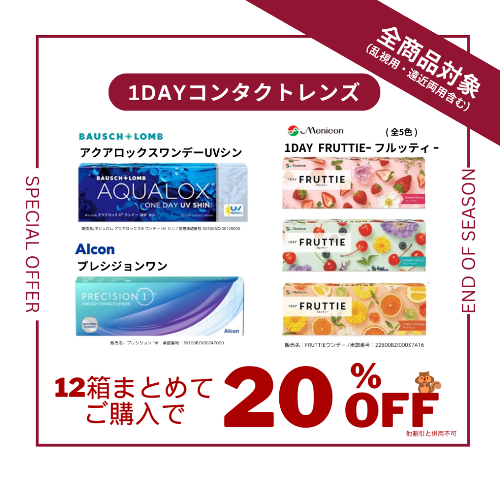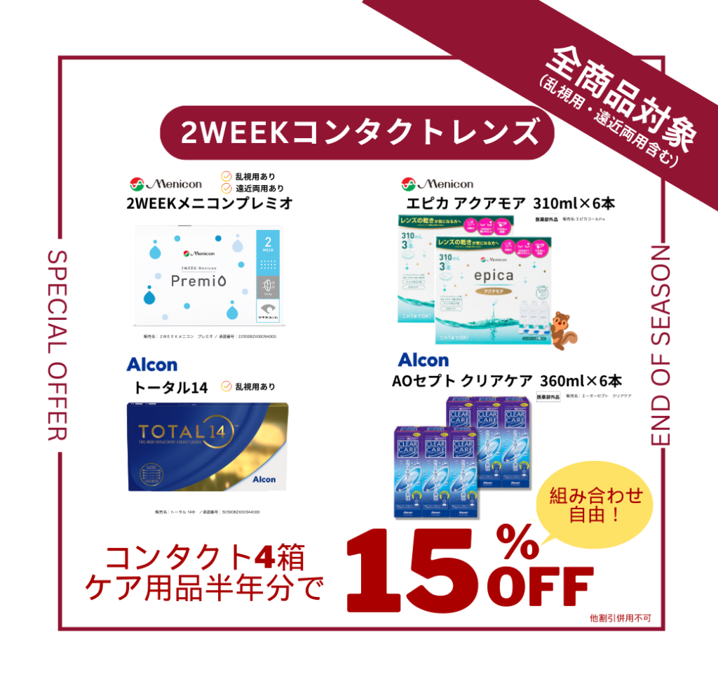 コンタクトレンズ4箱+ケア用品(洗浄液)半年分のご購入で店頭価格より15%OFF