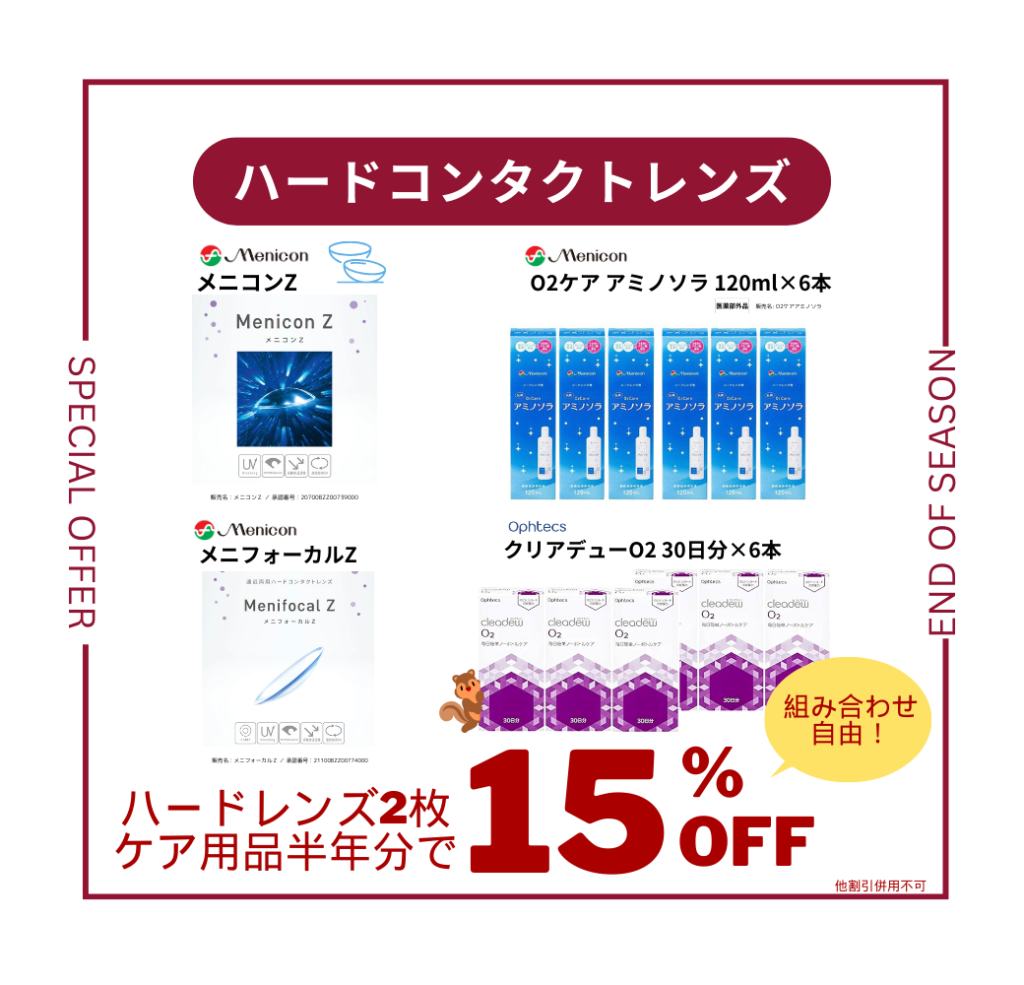 ハードレンズ2枚+ケア用品(洗浄液)半年分のご購入で店頭価格より15%OFF