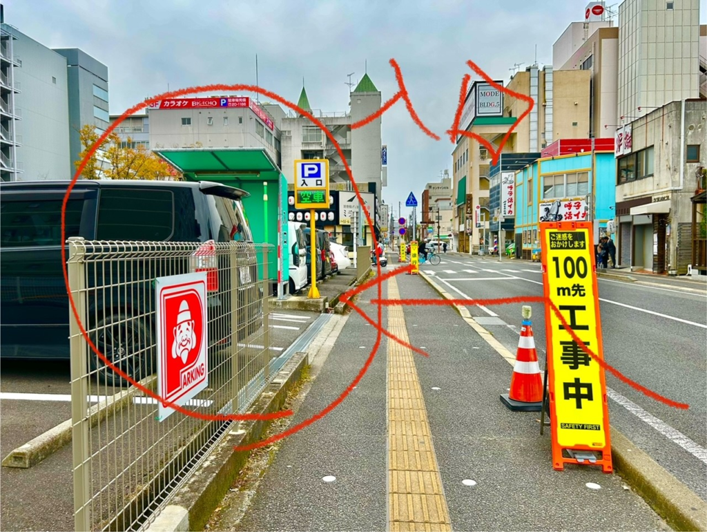 入口は交番側にもあるので駅前交番の道から入っても停めれます。