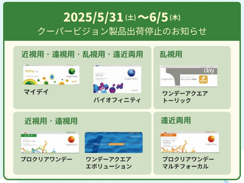 NEWS 佐賀店*クーパービジョン社システム変更によるコンタクトレンズ出荷停止のお知らせ