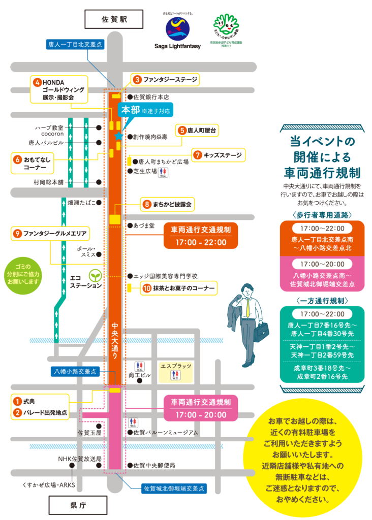 中央大通りにて、車両通行規制となりますので、お車でお越しの際はお気を付けください。