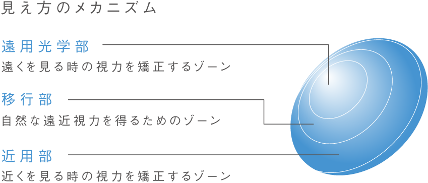遠近両用使い捨てレンズはレンズ内に複数の度数域が配置されており、脳の働きを利用して必要な距離にピントを合わせ、眼鏡の煩わしさ(フレームや曇り)から解放されるのが特徴で、近年は乱視用も登場しています。