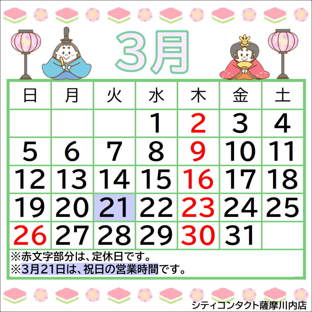 【薩摩川内店】3月休診日のご案内
