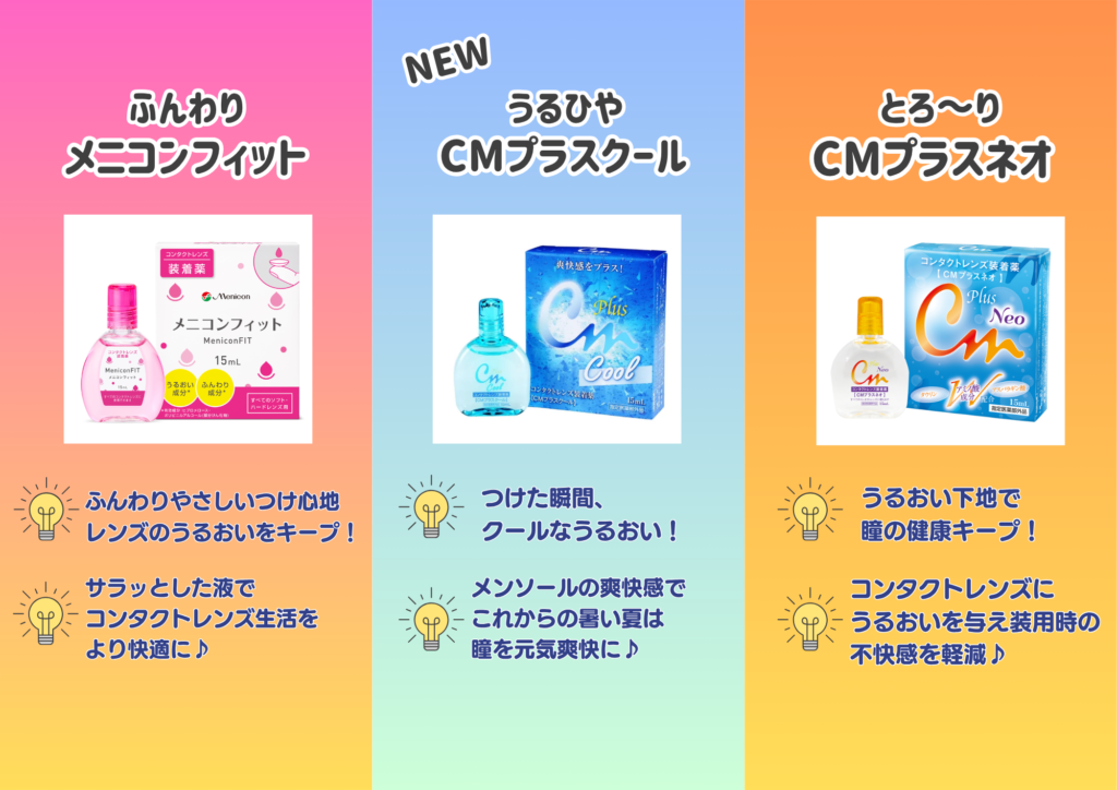 薩摩川内店では、3種類の装着薬、ハードコンタクト用も合わせると4種類取り揃えております。