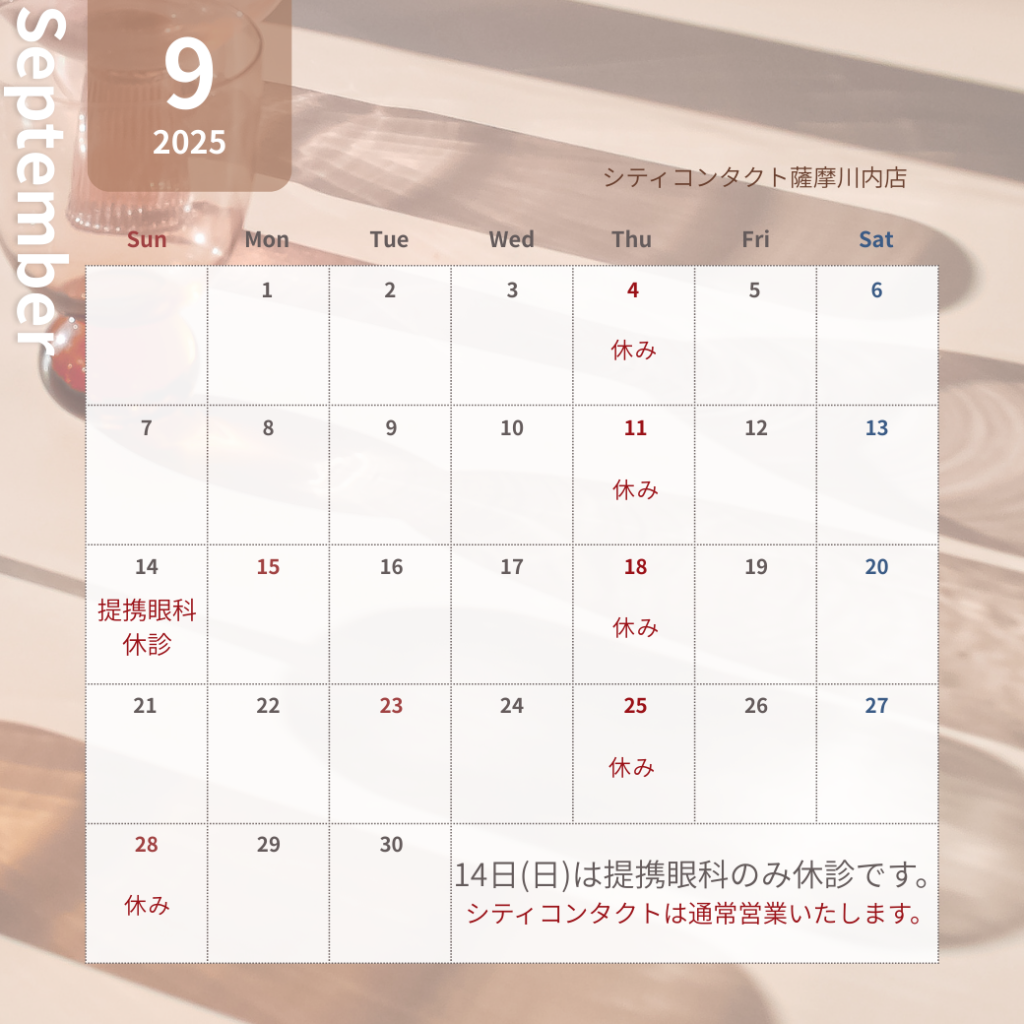 ※9月14日は提携眼科のみ休診、シティコンタクトのみ営業しております。