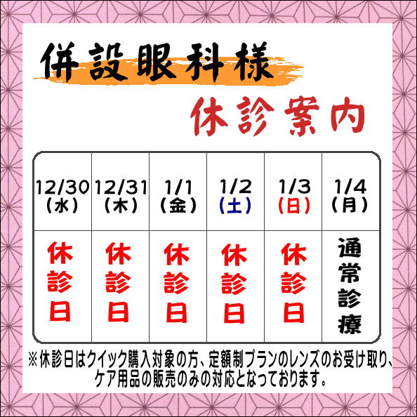 【イオン鳥取北店】併設眼科様年末年始休診日